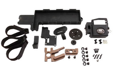 Das Hardware Kit im Bild oben enthält alles, um aus einem Losi 8ight oder 8ight-T einen 1/8 BL-Buggy bzw. BL-Truggy zu machen: Alu-Motorhalter (als erweiterter Mitteldiffbock), angepasste Radioplatte, Akkuhalterung für bis zu 5s Lipos sowie 2 Ritzel (jeweils für den Buggy bzw. Truggy), HZ und sämtliche Schrauben sind dabei.