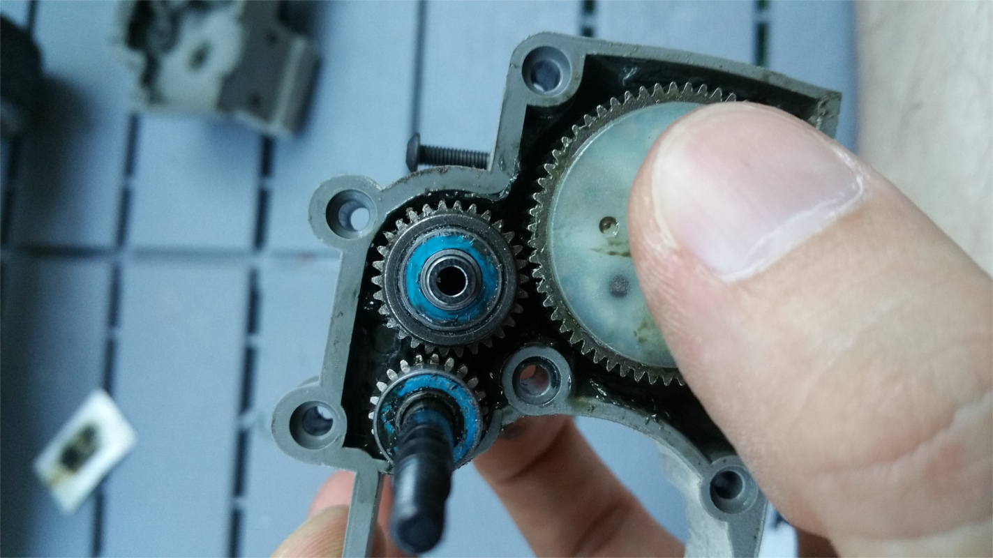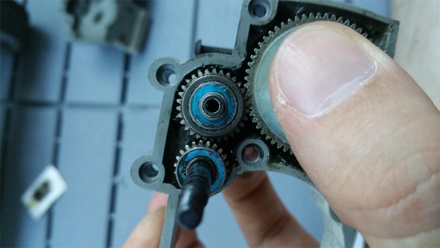 Nachdem ich die Lager getauscht habe habe ich es natürlich direkt mal ausprobiert... Ohne Erfolg, immernoch dreht der Motor aber das Auto bewegt sich kein bisschen. Da wollte ich mich grade zum Diff vorarbeiten da lacht mich das Zahnrad am Motor an. Es hing da einfach so rum, die Madenschraube, die das Zahnrad am Motor halten sollte hat sich verabschiedet. Es waren also nicht die Lager, sondern lediglich eine Gewindeschraube, die ich verloren habe :/