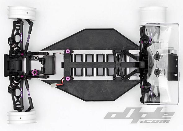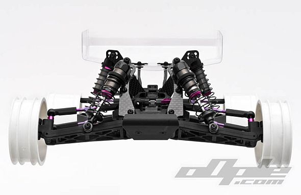 | Der D2 verfügt über ein 3mm Aluminium Chassis mit Kunststoff Side Pods. Das Aluchassis zieht sich bis nach vorne und ist entsprechend gebogen um einen Kick-Up Winkel zu erreichen. Das Chassis weisst über 7 Akkuöffnungen auf für normale NiCd oder NiMh Zellen, separate Kunststoffeinlagen schützen vor Kurzschlüssen. Durch die 7 Positionen, können die Akkus entsprechend weiter vorn oder hinten platziert werden. |