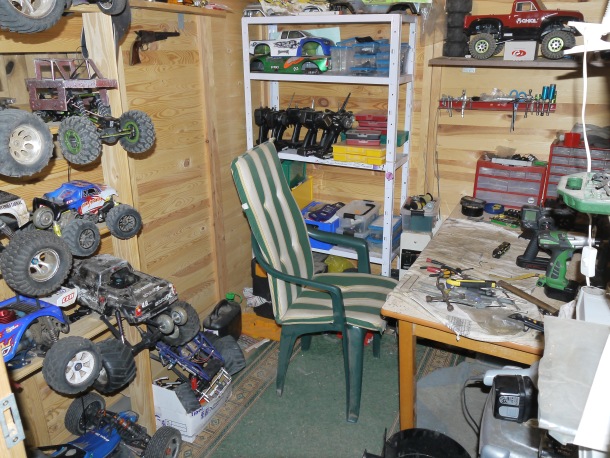 Mein Bastelplatz . Eine Laube in meiner LKW Garage . Die ET und anderen RC s lagern in Regalen oder auf dem Dach der Bude