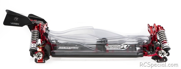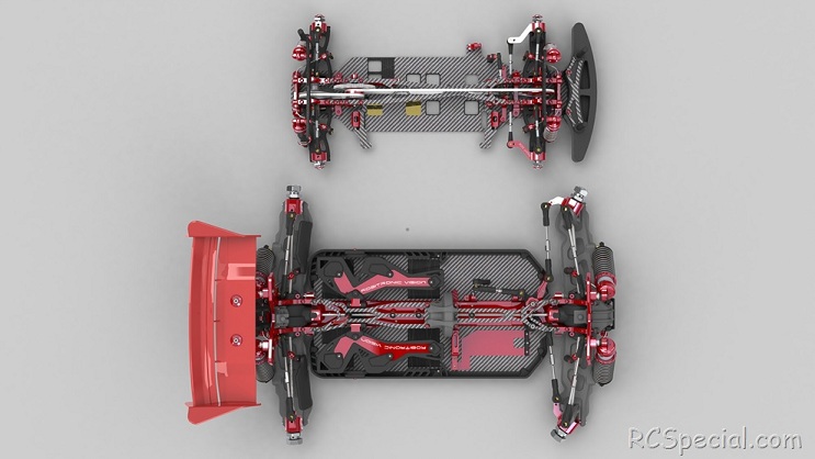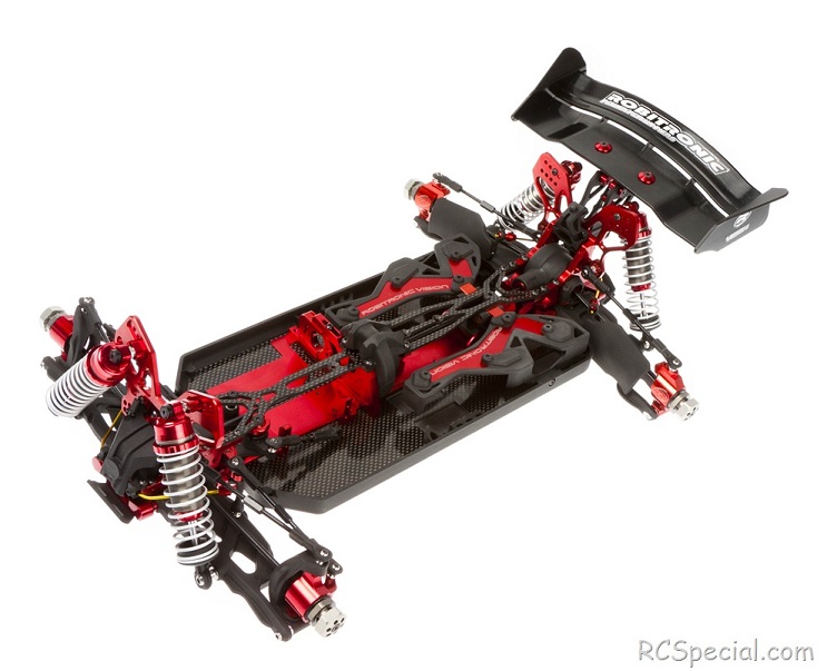 Dennoch hat Robitronic versucht einen neuen Weg einzuschlagen, wenn auch die 3 Kg Marke von meinen erhältlichen Umbausätzen schon regelmäßiger geknackt wurde. Die Mischung aus Aluminium und Kohlefaser ähnelt meinen V1 und V2 Chassis ebenfalls hier und da ein bisserl. Neu sind die Akkuhalterung (eine Art Klappkonstruktion mit Schraubbefestigung) sowie die Dämpfer. Es kommen Big-Bore Versionen mit exzentrischer oberer Befestigung zum Einsatz und zusammen mit den recht dicken Querlenkern wirkt dieser Teil irgendwie vertraut, da halt 1:8 übliche Dimensionen.