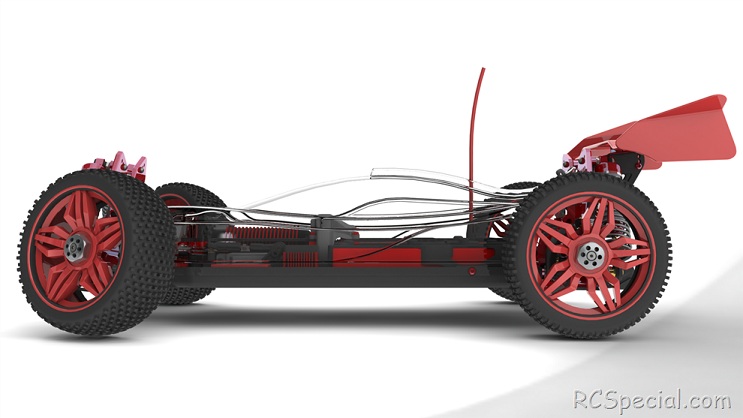 Den Buggy habe ich mir sehr genau ansehen können, nur Bilder waren halt leider nicht drin. Das Gewicht von 3 Kilogramm fahrfertig wird nur über einen sehr leichten Antriebsstrang ermöglicht. Daher ist alles für den 1:8 Bereich unüblich kompakt ausgefallen. Vieles würde man eher an einem 1:10 Buggy vermuten.