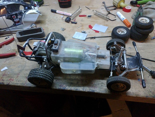 Noch zu machende Arbeiten: Regler und Empfänger einbauen, Dämpfer befüllen, Drehstab hinten Rechts einhängen und