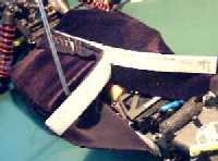 Die 3 Bilder zeigen wie's geht: Klettband am Chassis fixieren, aus dehnbarem Stoff zwei Hälfen zuschneiden, die in ihrer Form und Größe dem Chassis entsprechen und beide mit jeweils zwei Streifen Klettband versehen. Besonders interessant für Cars mit Brushless Antrieb da hier in der Regel keine Hitzeprobleme auftreten.